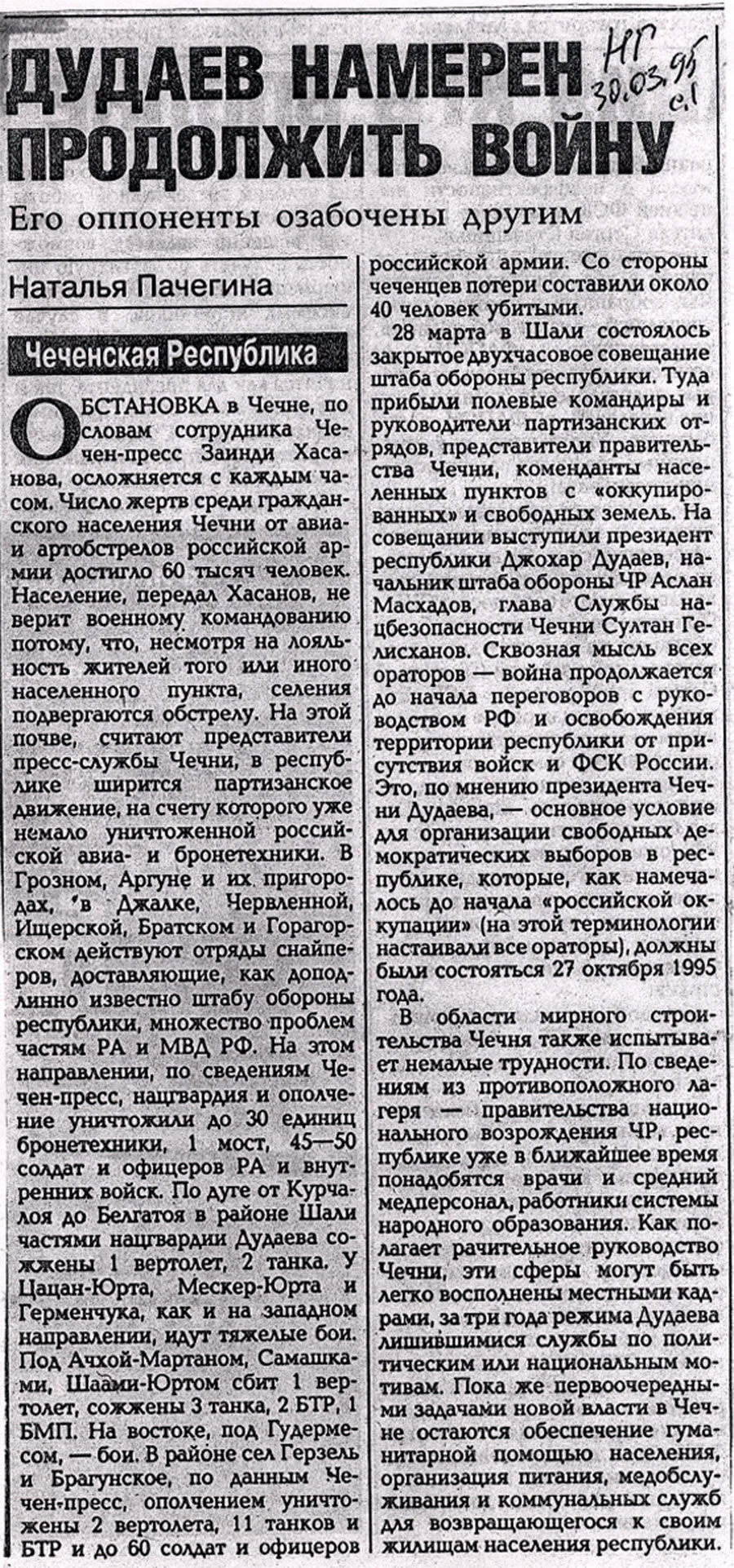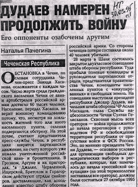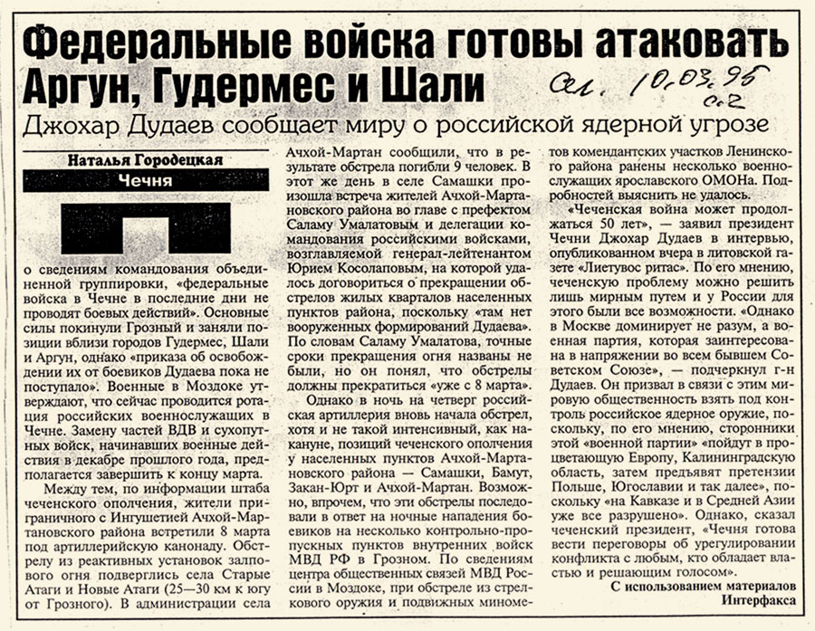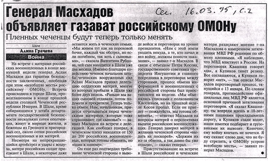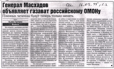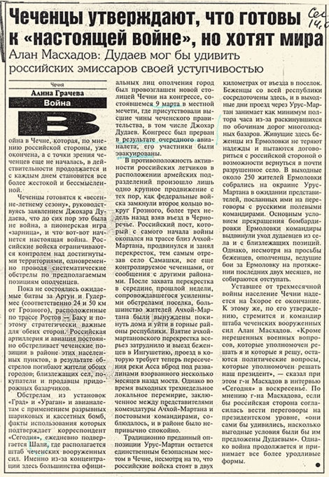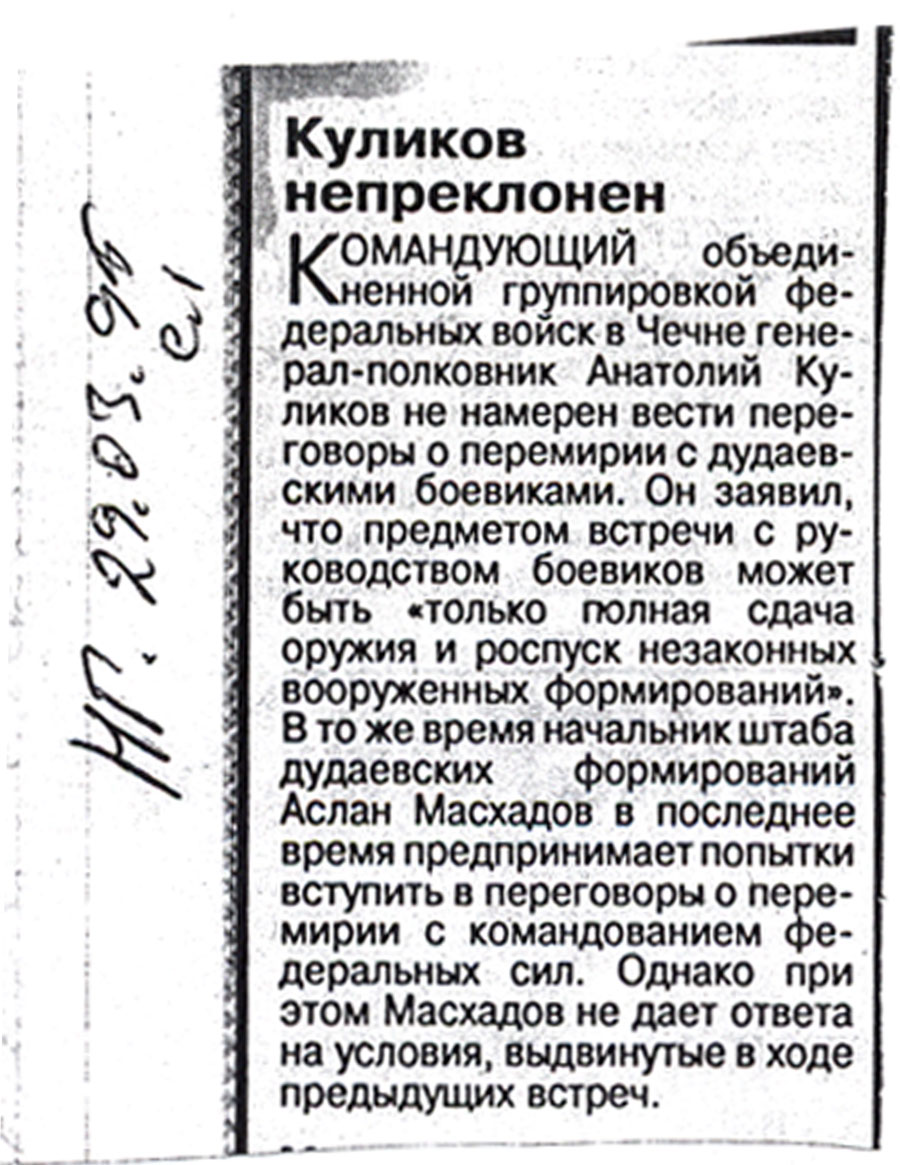 28 марта - Масхадов обратился к Куликову с предложением о переговорах. Тот отказал: «предметом переговоров - только сдача оружия».