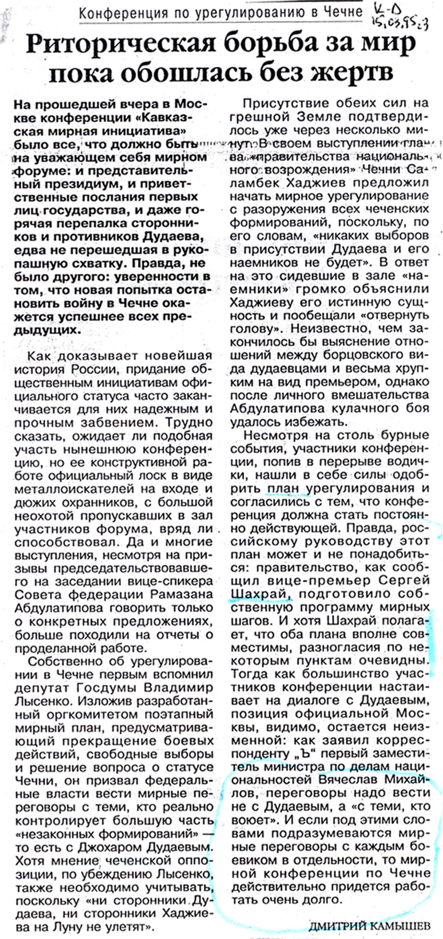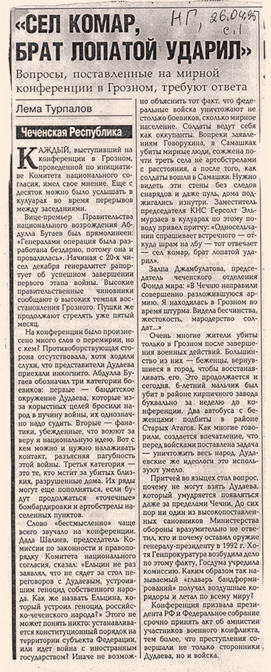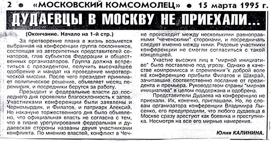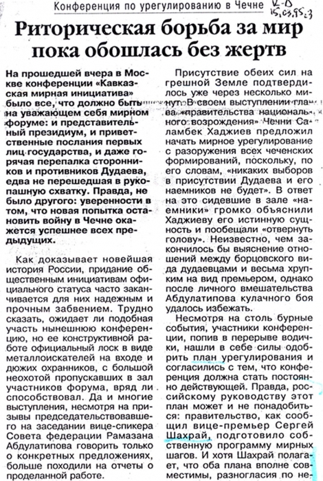 С февраля шли разговоры о необходимости проведения мирных конференций: в Махачкале, в Пятигорске, в Москве. Однако в итоге всё свелось к «полукруглым столам», на которых были представлены московские чиновники и лояльные им представители «с мест»: сепаратистов либо не звали, либо не гарантировали им безопасность.