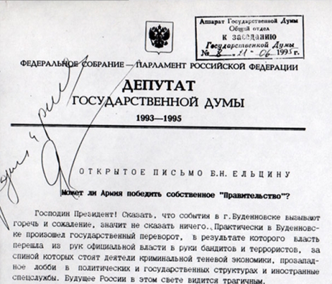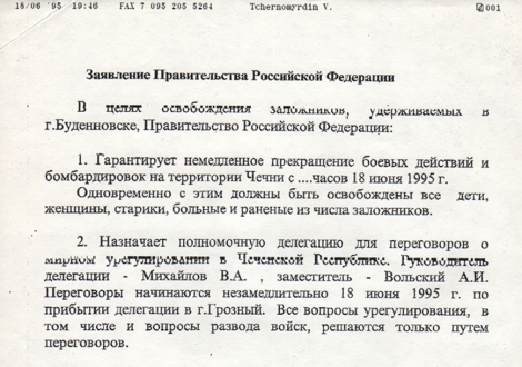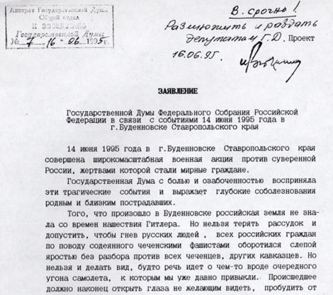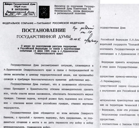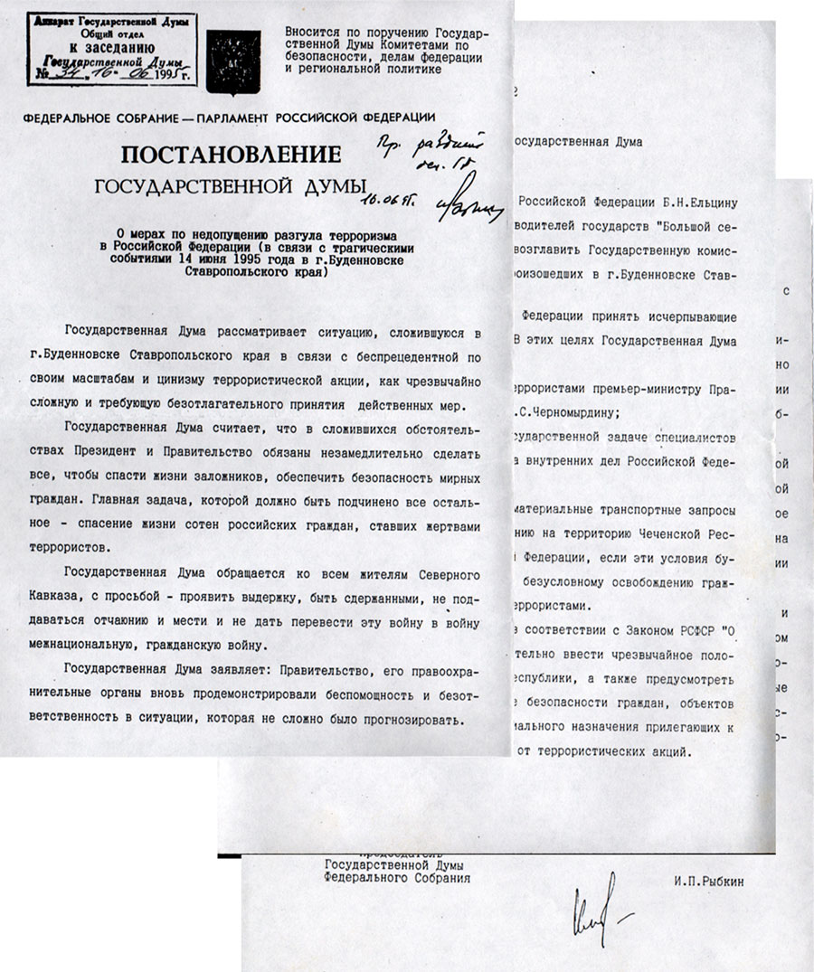 14 июня 1995 г. в Ставропольском крае были остановлены грузовики, в которых скрывался отряд боевиков под командованием Шамиля Басаева. Машины препроводили в Буденновск, к горотделу милиции. Боевики взяли отдел штурмом, и начался небывалый по масштабу террористический акт.