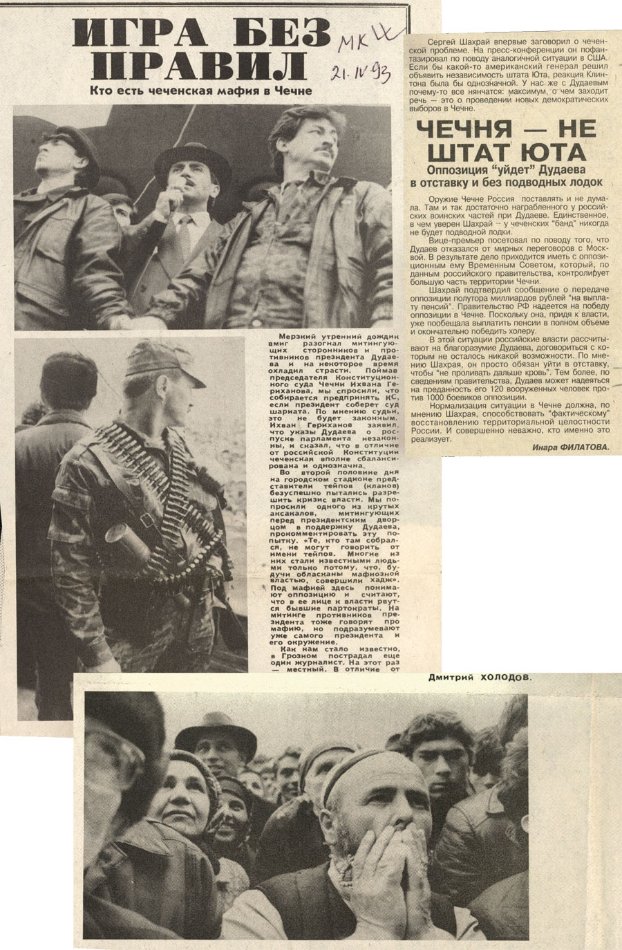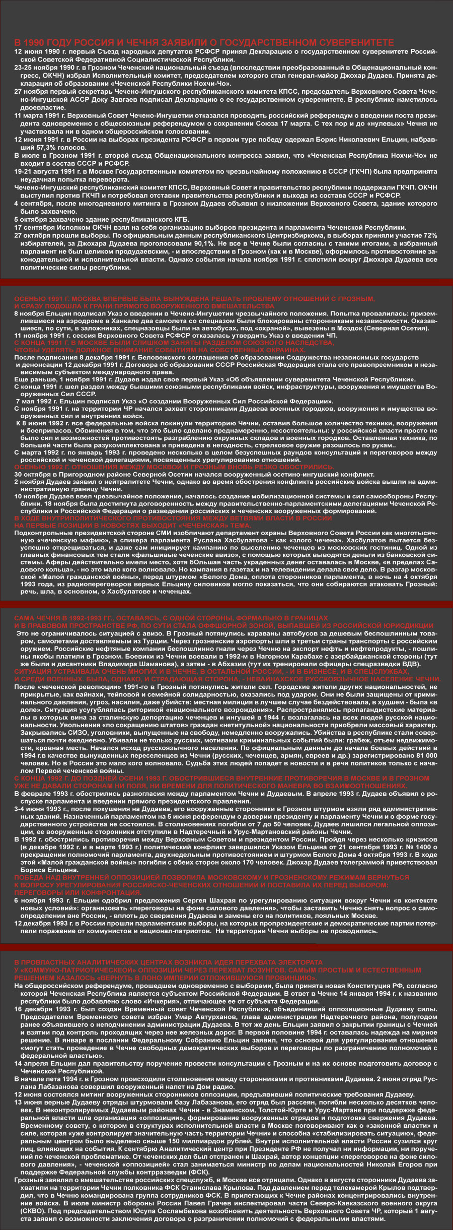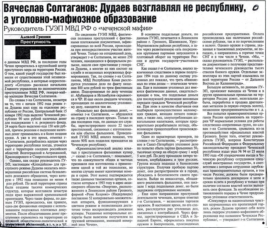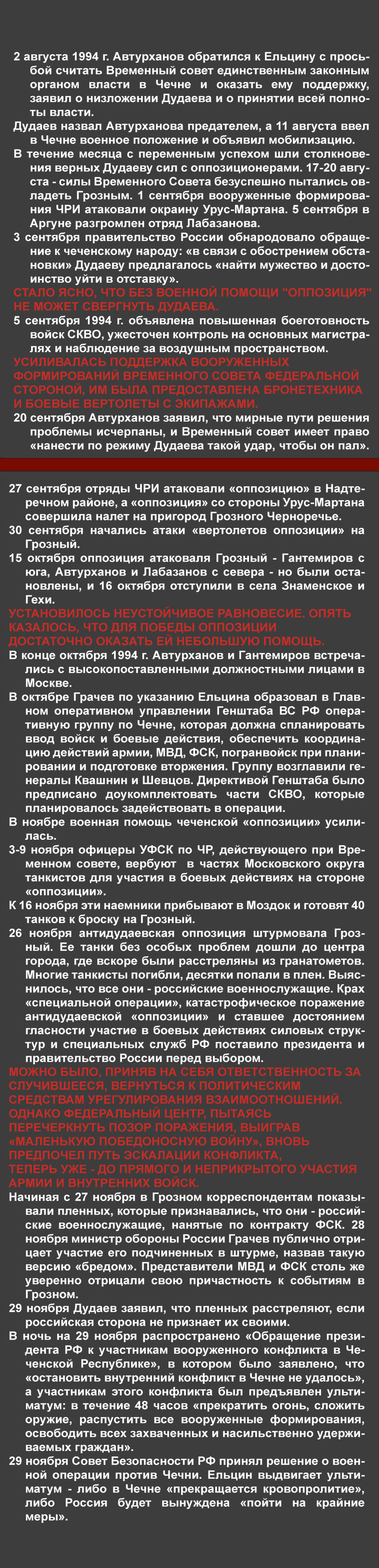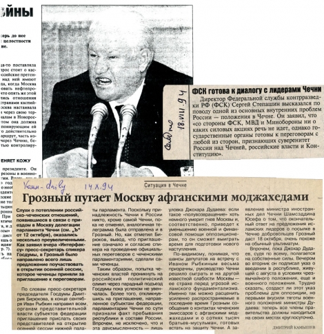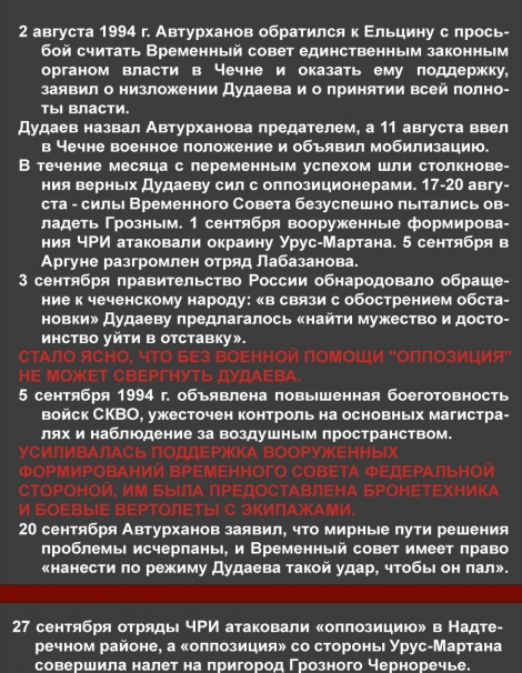 – В 91-ом. Все эти события транслировали по радио. Мы сидели на работе, у нас в кабинете было радио, и мы слушали эти восторженные репортажи с места событий, как захватывали радиоцентр, потом телецентр, изгоняли Завгаева из правительственного здания. Потом пришел момент, когда приехал Дудаев, когда его показали народу, представили. Потом выборы были президентские, все было очень красиво. Потом клятва Дудаева на Коране была. После его инаугурации пошли будни. Начал он с того, что распустил тюрьмы. Тюрьмы были закрыты. Все преступники были отпущены на свободу. Этому предшествовало событие, когда были выведены войска из Грозного. Войска выводились таким странным путем, что уехали все военнослужащие и увезли свои семьи. Все воинские части были оставлены: оборудование, обмундирование, военная техника. Было оставлено все. И началось мародерство.