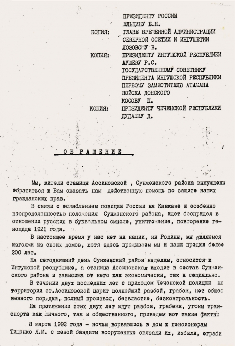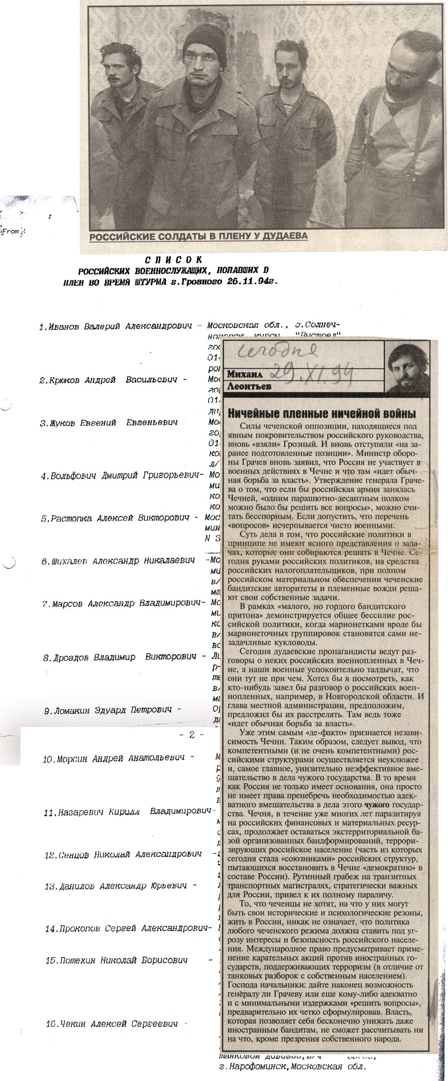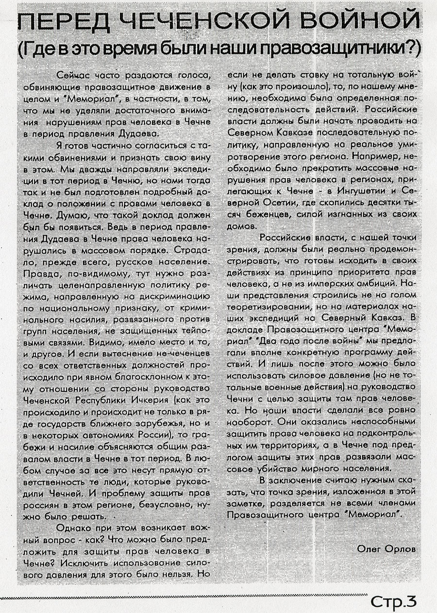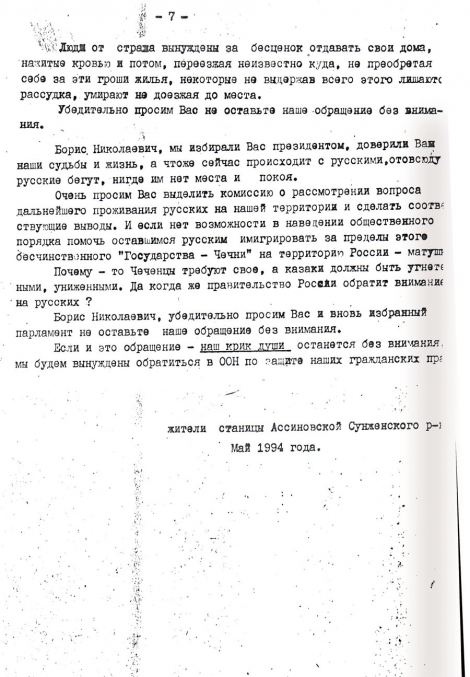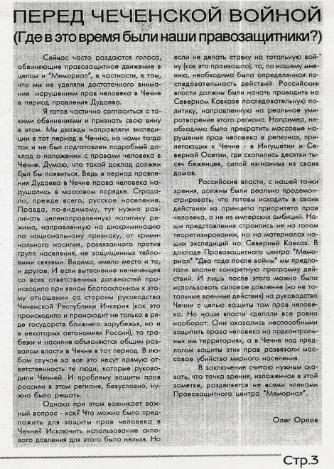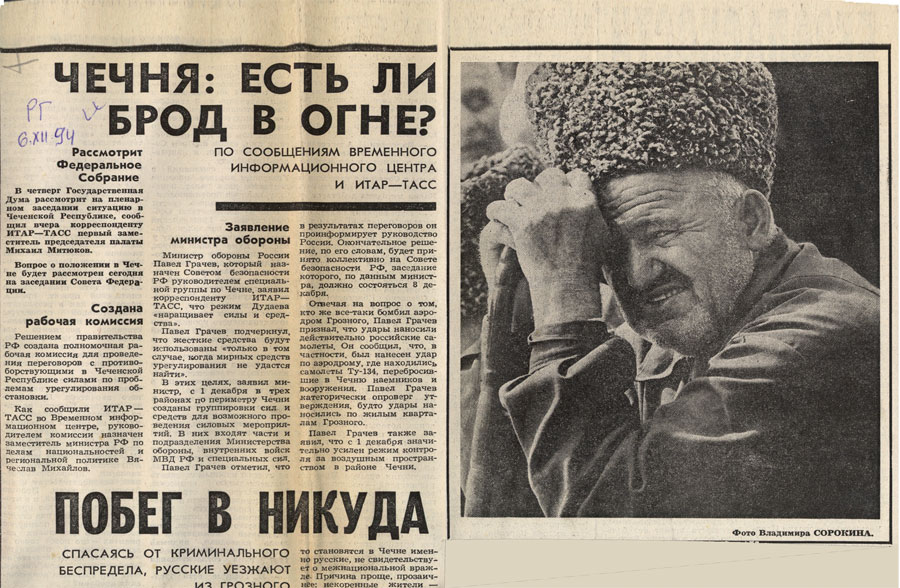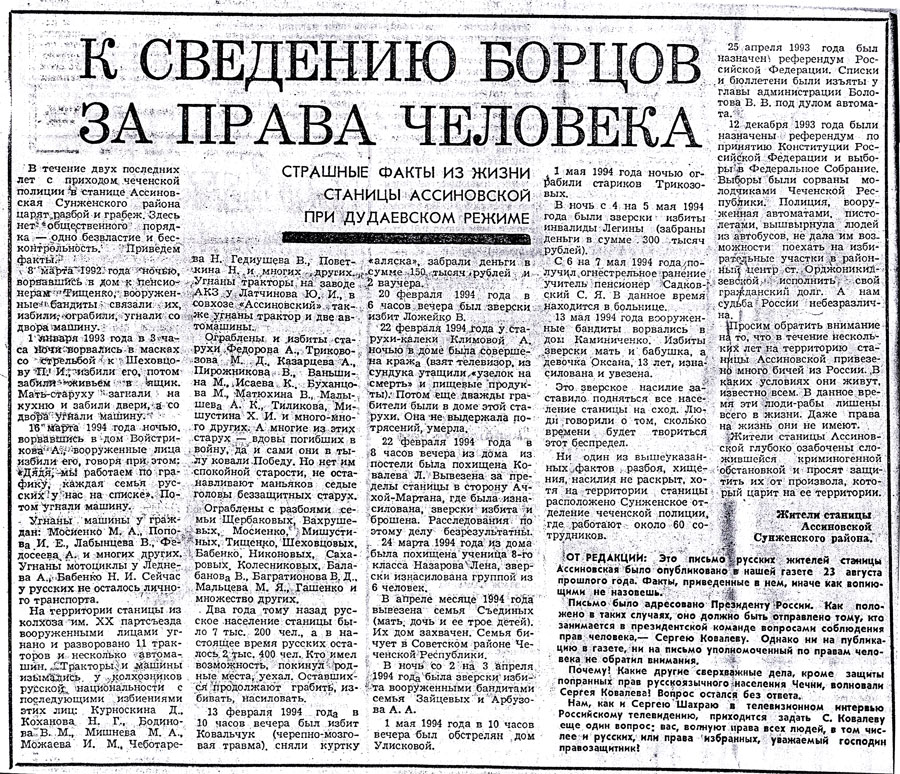 002 - …Потому что с 91-го года у нас в Чечне был бардак -для нас, живущих там, это не секрет, а было секретом, по-мое¬му, для нашего правительства, потому что у нас уже в тот период было свободным и ношение оружия и гранат, убивание людей, исчезание людей. В общем-то некуда было обратиться, никому мы были не нужны, а России тем более.